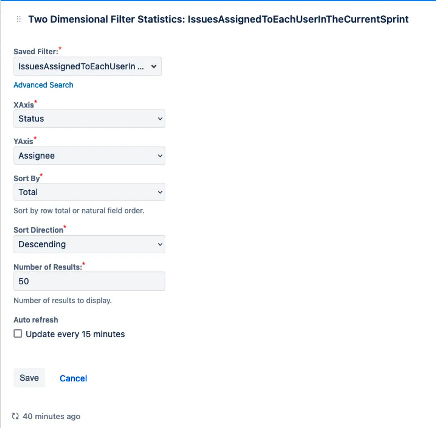 project = "SRCLOUD" AND sprint in openSprints () and statusCategory not in (Done)2. Create a two-dimensional filter statistics gadget on a dashboard configured as below. Here’s a great refresher on how to build a dashboard.