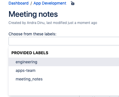 Beyond labels specific to each team and space, it is a good idea to create a series of very generic labels like ‘video’ or ‘release_notes’, in case you, as a global or space admin, need to quickly list all pages that have videos on them, or all pages that are release notes.